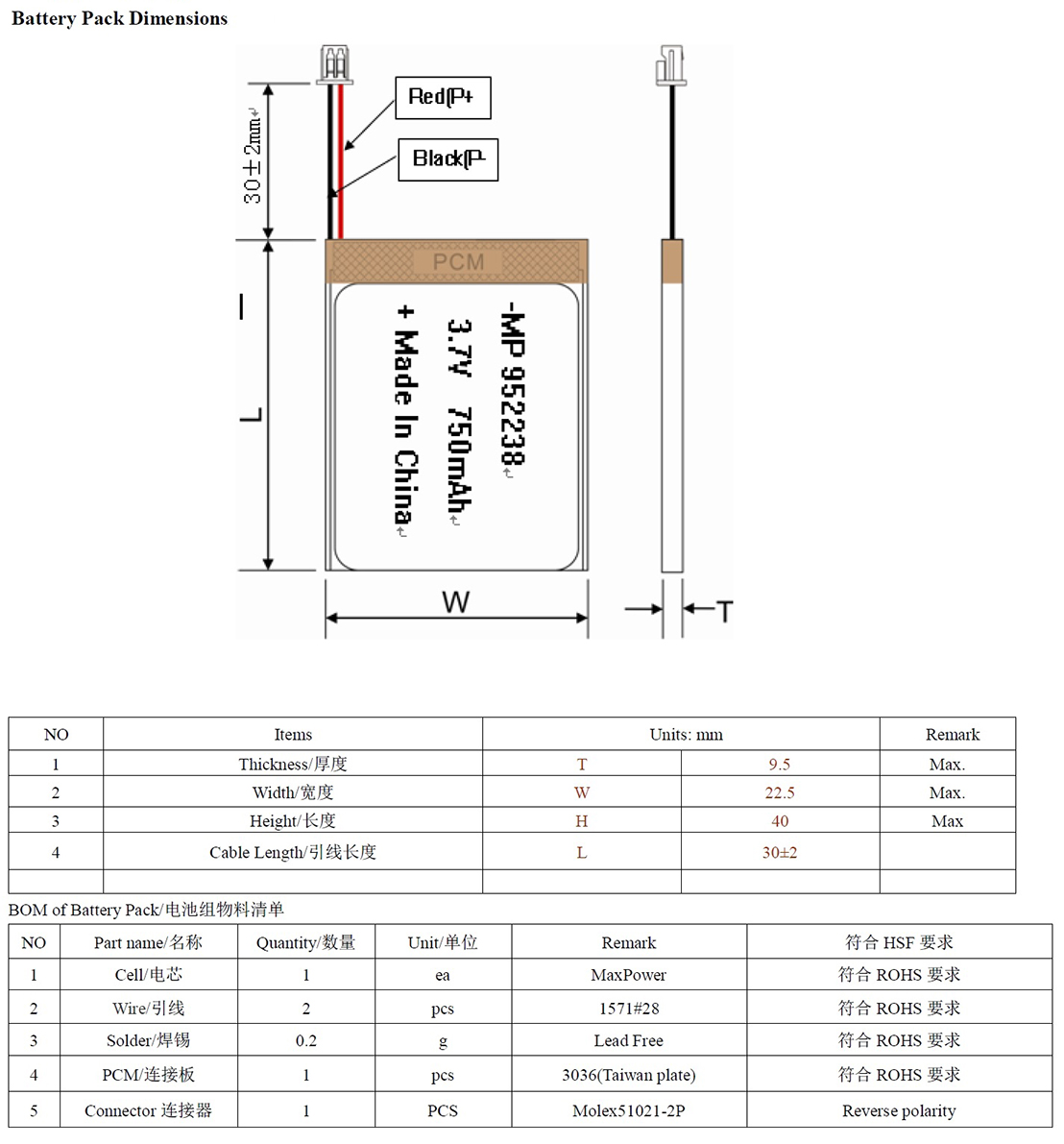 Maxpower MP952238P-PCM(3.7V 750mAh)