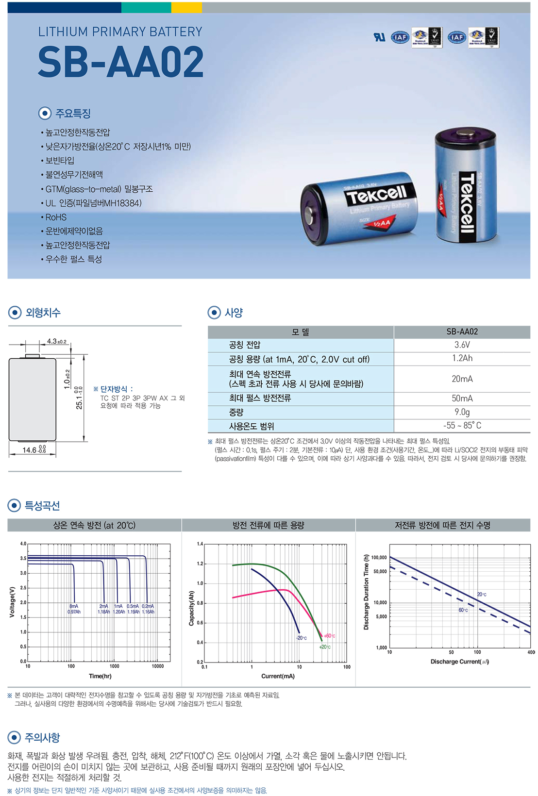 공칭용량 : 1,200mAh(1.2Ah) (at 1mA, +20℃, 2.0Vcut off)